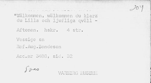 //// Jo 7 //// "Wälkommen» wälkommen du klara du Lilla och ljufliga qväll - //// Aftonen. hskr. 4 str. //// Vessiqe sn //// Re f.Aug.Bondeson //// Acc.nr 3488. sid. 32 //// 1 //// ' VARBERG MUSEUK i //// I ////