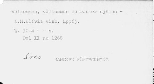 //// Välkommen, välkommen du rasker sjöman -I.H.Ulfvis visb. Lppfj. //// W. 10.4 - - s. //// Del II nr 1268 //// rancken förteckning //// | ¦ //// i //// k = ////