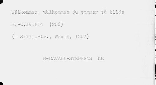 //// ! //// Wälkommen, wälkommen du sommar så blida H.-C.IV:B:4 (266) //// ( = Skill.-tr.P Wexio, 1007) i //// - //// ' i //// H-CAVALL-STEPHENS KB ' |: //// k ////