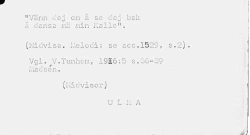 //// "Vann dej om å se dej bak å dansa rnä min Kalle". //// (Nidvisa. Melodi: se acc.1529 , s.2). Vol. V.Tunhem, 1916;5 s.36-39 //// 7 ' .1 //// iViaasen. //// (Nidvisor) //// U L M A //// .. ... . . j ) ////
