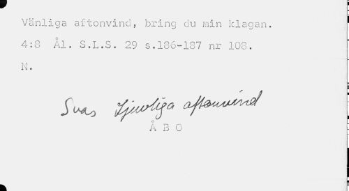 //// Vänliga aftonvind, bring du min klagan. ' //// 4:8 Ål. S.L.S. 29 s.186-187 nr 108. N. //// A B 0 - //// k r ////
