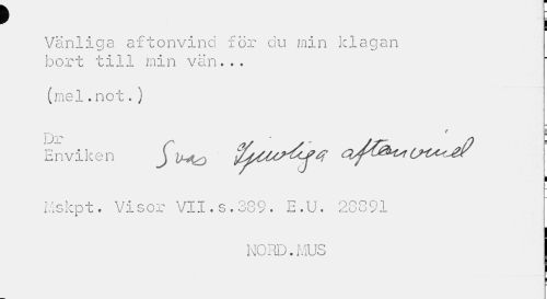 //// f k //// Vänliga aftonvind för du min klagan bort till min vän... //// (mel.not.) //// Enviken j ^ ^UJ^^ //// _ i //// Mskpt. Visor VII.s.389. E.U. 28391 //// NORD.MUS ////