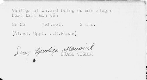//// Vänliga aftonvind bring du min klagan bort till min vän //// Nr 52 Mel.not. 2 str. //// (Åland. Uppt. a.K.Ekman) //// J X BilAGE VISBOK - //// 4 //// \ ¦ //// t F ////