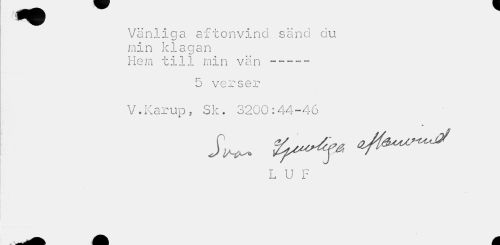 //// Vänliga aftonvind sänd du min klagan //// w //// Hem till min vän --- //// 5 verser //// V.Karup, Sk. 3200:44-46 //// fy"*? //// L U F ////
