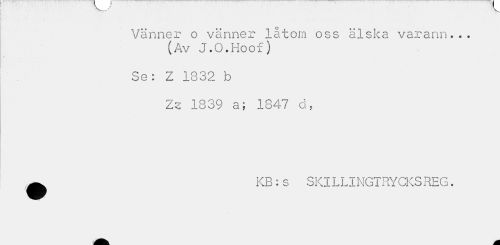 //// Vänner o vänner låtom oss älska varann... (Av J.O.Hoof) //// Se: Z 1832 b //// Zs 1839 a; 1847 d, //// ^ KB:s SKILLINGTRYCKSREG. ////