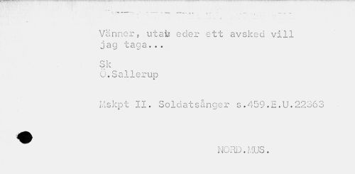 //// -l , " ~ --- — — < , - ¦ . , . — * //// Vänner, utafe eder ett avsked vill //// r jl. //// j 3 9 x s 9 3 c « . Sk //// t 4 //// O.Sallerup //// Hskpt II. Soldatsånger s.459.E.U.22363 //// NORD. MUS. ////