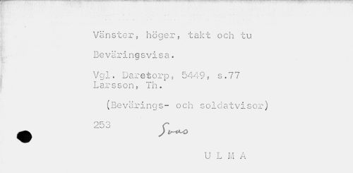 //// Vänster, höger, takt och tu Beväringsvisa. //// Vcl. Daretorp, 5449, s.77 //// Å //// Larsson, Th. //// (Beväri ng s- och sold atvis or) 253 r //// U L M A ////