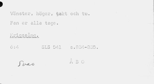 //// w //// Vänster, höger, takt och tu. Fan er alla taqe. //// Krigssång. //// 6:4 SLS 541 s.834-835. //// * //// | //// i^o Å B 0 ////