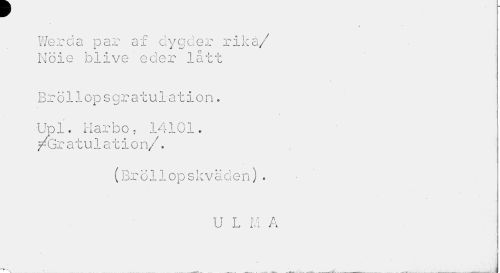 //// V/erda par af dygder rika/ Nöie blive eder lått //// B r ö 11 o p s g r a t u 1 a t i o n. //// Upl. I-Iarbo. 14101. /Gratulation/. //// (Brollopskväden). //// U L ifi A //// . i ////