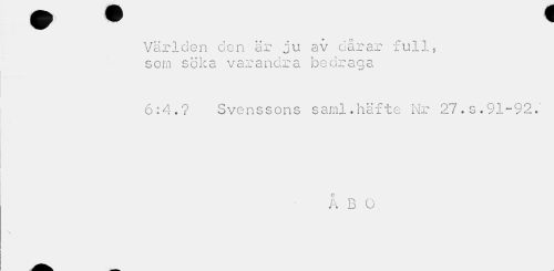 //// Världen den är ju av dårar full, som söka varandra bedraga //// 6:4.? Svenssons saml. häfte Nr 27 . s . 91-92." //// Å B O //// N ////