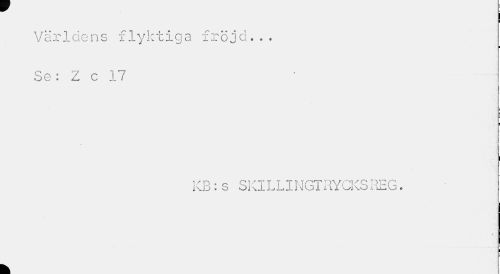 //// I //// Världens flyktiga fröjd... Se: Z c 17 //// .i //// KB:s SKILLINGTRYCKS REG. //// k ////