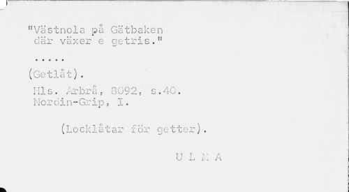 //// "Västnola på Gätbaken där växer e getris. n //// w/ //// • « * e t //// (Getlåt) . //// Hls. Arbrå, 8092, s. 40. //// Nordin-Grip, 1. //// (Locklåtar för getter). //// t t t t a U la i V i ti ////