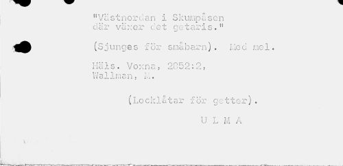 //// "Västnordan i Skumpåsen där växer det qetaris. 11 //// ^^ (Sjungas för småbarn). Lie a mel. //// 1-4 "i o o° r o « o //// i ld JL b . V O n o j Zo J Z * Z « //// 1 1 rn v- l: v v cl j» j-lao. i i « i Vi * //// (Locklåtar för getter). //// U L M A //// • • . ////