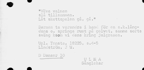 //// "Väva valman //// slå tillsamman. //// Låt skottspolen gå, ga." //// Barnen ta varandra i hane för en s.k.långdans o. springa runt på golvet, samma sorts sväng ksom vi dans kring julgranen. //// Upl. Tensta, 18225, s.4-5 Lindström, J W. //// D Danser 10 //// ——---U L M A //// Sånglekar //// A ////