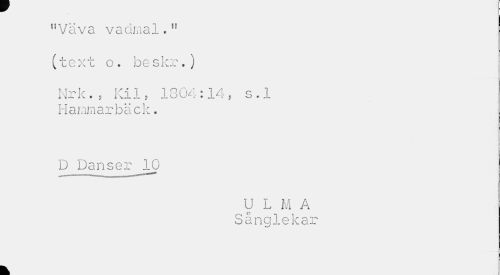 //// "Väva vadmal." //// (text c. be skr.) //// Nr k.5 Kil, 1804:14, s.l Hammarbäck. //// D Danser^lO //// U L M A //// Sånglekar //// k ////