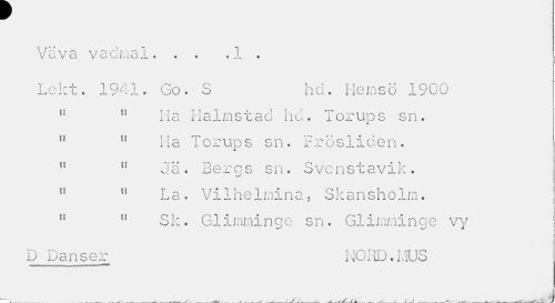 //// V cl V B V o Q i i i a . l c ? « « ."L « //// Lekt. 1941. Go. S hd. Hemsö 1900 //// C t i g TT TT*: t Til T* //// 11 ff Ha i x a 1 m s x a o ho . i or up s s n. //// f? n Ha Torups sn. Frösliden. //// " !f Jä. Beros sn. Svenstavik. //// !i " La. Vilhelmina, Skansholm. //// 11 n Sk. Glimminge sn. Glimminae vy //// D Danser NORD.MUS ////
