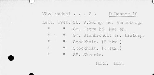 //// Väva vadmal , . . 2 . D Danser 10 //// 7 --' //// Lekt. 1941. Sk. V.Göinge ho. Vanncberga //// " Sm. Östra hö. Nye sn. //// " " Sm. Stenbrohult sn. Liatorp. //// " » Stockholm. (8 stx.) //// 11 " Stockholm. (4 str.) //// ^^ 11 " Sö. Skresta. //// NORD. MUS. ////