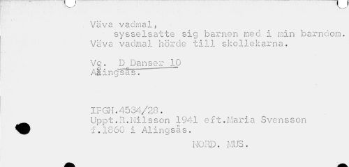 //// x—• //// . Väva vadmal, //// sysselsatte sig barnen med i min barndom. Väva vadmal hörde till skollekarna. //// Vg. D Danser 10 Alingsås. //// IF G!-1.4534/28. //// ^^ Uppt. 11.Nilsson 1941 ef t.Maria Svensson //// ^^ f.1860 i Alingsås. //// NORD. MUS. ////