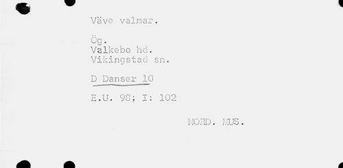 //// Väve valmar. t p //// Cg. //// Valkebo hd. Vikingstad sn. //// D Danser 10 E.U. 98; I: 102 //// NORD. MUS. ////