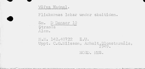 //// Väfva Wadmal. ^^ Flickornas lekar under skoltiden. //// Sm. D Danser 10 Stranda //// v //// Al em. //// N.M. 142.40722 E.U. //// Uppt. C.G.Milsson, Arhult,Blomstermåla, //// 1949. //// NORD. MUS. //// i\ ^-.r--^ ""»""l*'-»—Tvt» . -W^r^—___. --t.^^v^T'-^»»r-Y»'.—— ..W. --»¦ _ -i-^Mr. —___ __ —___. ___. /Viv-i---_ _ . —. V.___v. ////