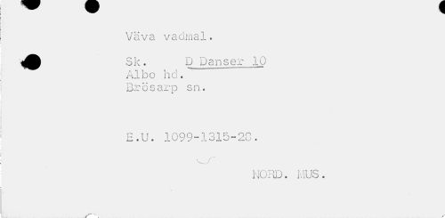 //// Väva vadmal. Sk. D Danser 10 //// A "1 ! _ } i //// Albo ha. Brösarp sn. //// E.U. 1099-1315-20. //// V I //// -- J //// NORD. MUS. ////