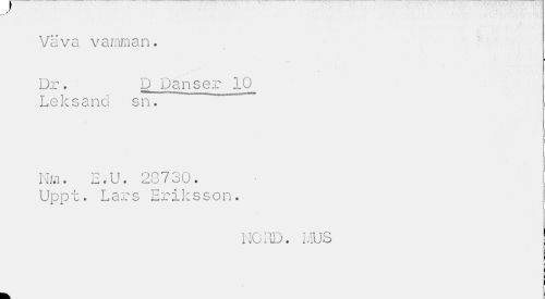 //// Väva v a inman. //// Dr. D Danser 10 //// Leksand sn. //// Mm. E.U. 28730. Uppt. Lars Eriksson. //// NCIID. LUS ////