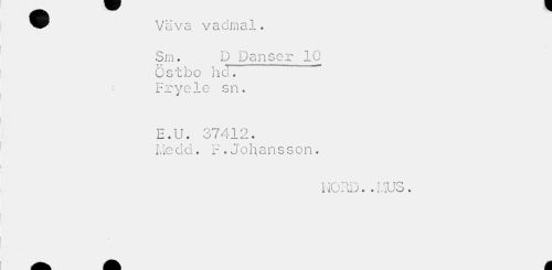//// ^^ Väva vadmal. //// Sm. D Danser 10 Östbo hd. • Fryele sn. //// E.U. 37412. //// Licdd . F . Johansson. //// NO, ID. . i.iUo . //// ^^ åk ////