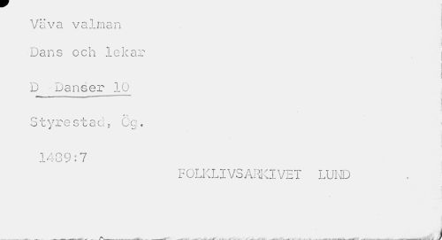 //// Väva valman //// •J //// Dans och lekar //// i //// D Danser 10 //// j //// * i //// Styre stad, Cg. 1489:7 //// FOLKLIVS ARK.! VET LUND ////