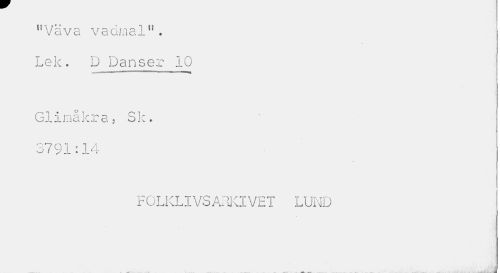 //// "Väva vadmal". Lek. D Danser 10 //// G, o O i s-H ¦» //// ^ I "l .O 1/" \r //// jJ.iu^r Q p OJ.v • //// 3791:14 //// F OLKLIVSARKIVET LUND ////