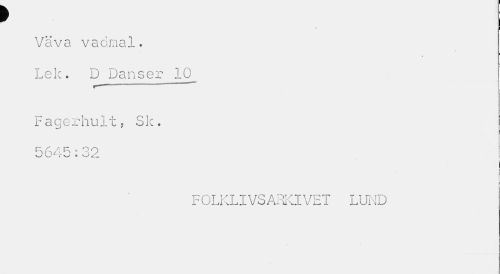 //// f //// Väva vadmal. //// å //// Lek. D Danser 10_ //// Fagerhult, Sk. 5645;32 //// FOLKLIVSARKIVET LUND ////
