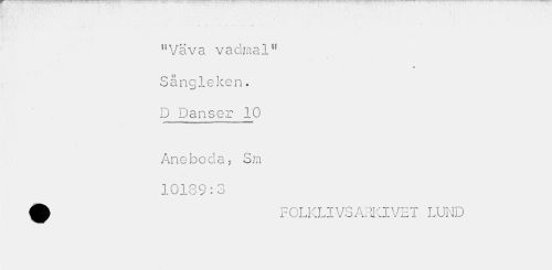 //// "•Väva vadmal" //// # //// Sångleken. D Danser 10 //// Aneboda; Sm 10189:3 //// 0 FOLKLIVSARKIVET LUND ////