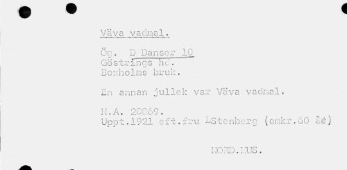 //// "•Väva vadmal" //// Ög. D Danser 10 GöstrIngs ho. Boxholms bruk. //// En annan jullek var Väva vadmal. //// H.A. 20G69. //// Uppt.1921 eft.fru LStenberg (omkr.60 åé) //// NORD. IRJS. ////