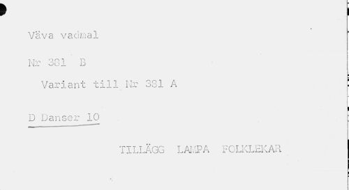 //// f I //// Väva vadmal //// Nr 381 B //// i //// Variant till_Ur 331 A ! //// i //// D Danser 10 ; //// TILLÄGG LAlviPA FOLKLEKAR //// 4 ////