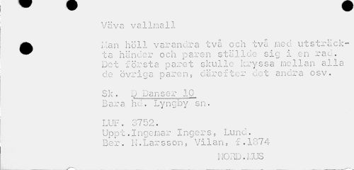 //// "Väva vadmal" //// Jfc Man höll varandra två och två med ut sträck- //// ^^ ta händer och paren ställde sig i en rad. //// Det första paret skulle kryssa mellan alla de övriga parens därefter det andra osv. //// Sk. D Danser 10 //// - ii -- //// Bara ho. Lyncby sn. //// . v. * O i OciJ - # //// Uppt.Ingemar Ingers, Lund. Ber. H.Larsson, Vilan? f c 1874 //// 110 RD. MUS ////