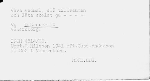 //// Väva vadmal, slå tillsamman och låta skelet qå - - - - ¦ //// Vc D Danser 10 //// w' —————— //// Vänersborq. IFGU 4514/33. //// Uppt.R.Nilsson 1941 e ft.Gu st.An derson £.1862 i Vänersborq. //// NO. LU * iViUS * //// --—^r—. -^ -. > ¦ ... ,,M,r ¦ « n ---V ^ ¦¦ --i. ***** 1 * ^ ////