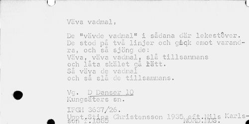 //// Väva vadmal. //// De "vävde vadmal" i sådana där lekestover. De sted på två linjer och gick emot varandra, och så sjöng de: Väva, väva vadmal, slå tillsammans och låta skälet gå tätt. Så väva de vadmal och så slå de tillsammans. //// Vg. D Danser 10 //// ^^ Kunasaters sn. //// t___.' //// IFGH 3637/26. //// Uppt.eStipg Christensson 1935 e£±.|J±ls Karls- ////