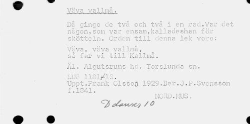 //// Väva vallrnå. //// Då gingo de två och två i en rad.Var det någon,som var ensam,kalladeshan för skötteln. Orden till denna lek voro: //// Väva, väva vallrnå, //// så far vi till Kallmå. 6 « //// Al. Algutsrums hd. Torslunda sn. LUF 1181/13. //// Uppt.Frank OIssoq 1929.Ber.J.P.Svensson //// f i o/ i //// jl . ± u cr x . //// NORD. I.OJS. //// A A ////