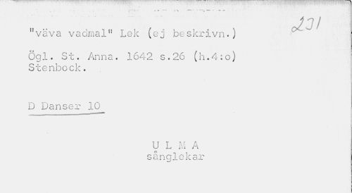 //// Jo/ //// "väva vadmal" Lek (ej beskriva.) //// Ögl. St. Anna. 1642 s.26 (h.4:o) Stenbock. //// D Danser 10_ //// U L M A //// sånglekar ////