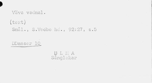 //// f //// Väva vadmal. (text) //// Smål., S.Vedbo hd.> 92:27. s.5 DDanser 10, //// 1 //// D L M A //// Sånglekar //// ] //// i i //// ¦ • - H //// I I ////