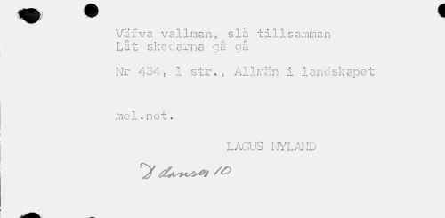 //// Vaiva vallman, slå tillsamman Låt skedarna gå gå //// Nr 4 34-, 1 str., A11 m a n i la n d s k a p e t mel.not. //// LAGUS NYLAND //// ^ /o ////