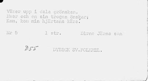 //// t * //// Växer upp i dala grönskan, | //// Hvar och en sin trogen önskar; | //// Kom, kom min hjärtans kära.' j //// Nr b I str. Dir ne Järn a' s:n.': //// 2>S'J>" DYBECK SV.FOLKMEL. //// I //// r //// I //// i //// £ I //// ...J ////