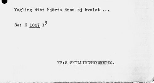 //// Yngling ditt hjärta ännu ej kvalet ... Ses E 1827 l5 //// KB:S SKILLINGTRYCKSREG. //// _ ___.. , .., ...J ////