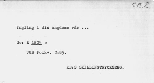 //// VV5X //// Yngling i din ungdoms vår ... //// Ses E 1805 e //// UUB Folkv. 2s85. //// KBsS SKILLINGTRYCKSREG. //// - i •• //// / ////