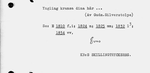 //// Yngling kransa dina hår . • • //// (åv Gudm.Silverstolpe) //// Se: E 1810 f,i; 1824 n; 1825 mmj 1852 1*$ //// 1854 w, //// KB: S SKILLINGTRYCKSREG. ////