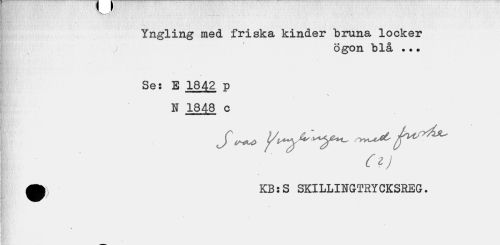 //// Yngling med friska kinder bruna locker / ögon blå ... //// Ses E 1842 p N 1848 c //// cd //// •) KB:S SKILLINGTRYCKSREG. //// / ////