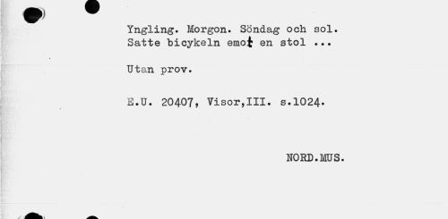 //// Yngling. Morgon. Söndag och sol. Satte bicykeln emot en stol ... //// Utan prov. //// E.U. 20407, Visor,III. s.1024. //// ? //// NORD.MUS. ////