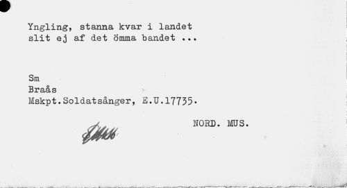 //// i //// Yngling, stanna kvar i landet ' //// slit ej af det ömma bandet ??? i //// i < //// i ¦ //// i ! //// sm //// Braås * //// Mskpt.Soldatsånger, E.U.17735• ! //// . i //// nord. mus. //// \ //// ___- __- -—v» A—-.-_—» — w - - -- - • . — — ^ ^ * i —. -w—___ V ""-X- __ ////