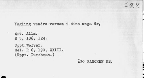 //// 2. v. K //// > //// f //// r //// i //// L //// Yngling vandra varsam i dina unga år, 4:6. Ållm. //// R 5, 186, 124* //// Uppt.Wefvar. //// Mel. R 6, 190, XXIII. (Uppt. Durchman.) //// ÅBO RANCKEN MS. 1 //// _ //// j //// 1 //// :— ////