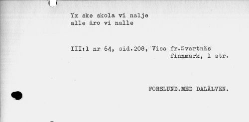 //// Yx ske skola vi nalje alle äro vi nalle //// 111:1 nr 64? sid.208, Yisa fr.Svartnäs //// finnmark, 1 str. //// p //// ö K • //// FORSLUND.MED DALÄLVEN. ////