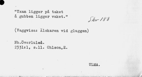 //// » //// "Yxan ligger på taket //// å gubben ligger vaket." ^ /jf# //// (Vaggvisa: Ålskaren vid gluggen) //// Fb.Överluleå. //// 2331sl5 s.ll. Ohlson,E. //// ULMA. //// f //// / ////